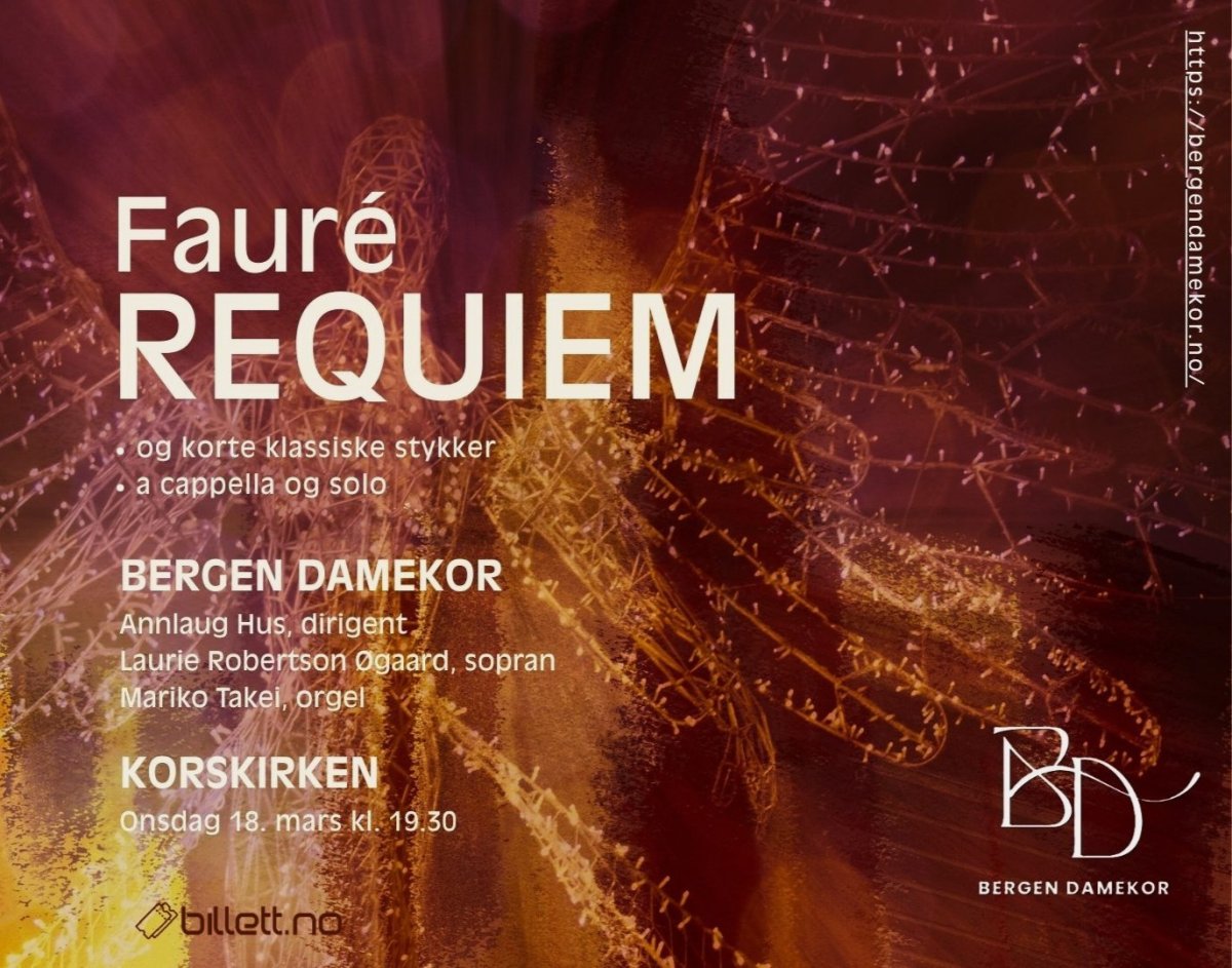 Hovedverket er Fauré sitt vakre Requiem i arrangement for damekor. Mariko Takei akkompagnerer på orgel, og Laurie Robertson Øgaard er sopransolist.